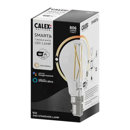 Die Calex Smart Standard LED Glühbirne B22 7W 806lm 1800-3000K CCT Fadenlampe kann nicht nur mit einem besonders einfachen Smart Lighting-Konzept aufwarten, Sie können die Farbtemperatur der Lampe zudem jederzeit nach Ihren eigenen Wünschen anpassen. Zudem ist im Preis eine Garantie von zwei Jahren enthalten.