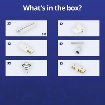 Beschreibung Komplettset 1-Phasen Rail 2 Meter Weiß | incl. 5x Spot + GU10 2700K 3W Dimmbar + Abschlusskappe, Stromanschluss und I-Verbinder