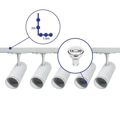 Beschreibung Komplettset 1-Phasen Rail L 1,5 x 2 Meter Weiß | incl. 5x Spot + GU10 2700K 3W Dimmbar + Abschlusskappe, Stromanschluss und L -Verbinder