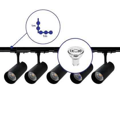 Beschreibung Komplettset 1-Phasen Rail L 1 x 1 Meter Schwarz | incl. 5x Spot + GU10 2700K 3W Dimmbar + Abschlusskappe, Stromanschluss und L -Verbinder