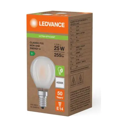 Die Ledvance LED Classic E14 Birne Fadenlampe Matt 1.2W 255lm - 840 Kaltweiß | Ersatz Für 25W ist eine effiziente E14 LED-Lampe mit Retrodesign und der perfekte Ersatz für Ihre konventionellen 25W Lampen mit E14. Zudem strahlt sie Licht in der Farbtemperatur 4000K - Kaltweiß aus und punktet durch eine lange Lebensdauer.