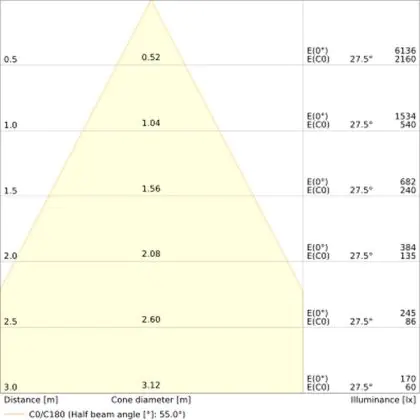 Der LED-Deckenspot kommt mit der Farbtemperatur 3000K - Warmweiß daher. Als Faustregel gilt: Je niedriger der Kelvinwert, desto gemütlicher wirkt das Licht.