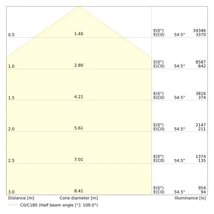 Beispiel: Wird eine Lampe mit einem Abstrahlwinkel von 60 Grad an der Decke (2,5 m Höhe) angebracht, erzeugt sie einen Lichtkegel von 2,9 Metern Durchmesser. Hat die Lampe hingegen einen Abstrahlwinkel von 120 Grad, beträgt der Lichtkegel 8,7 Meter im Durchmesser. |