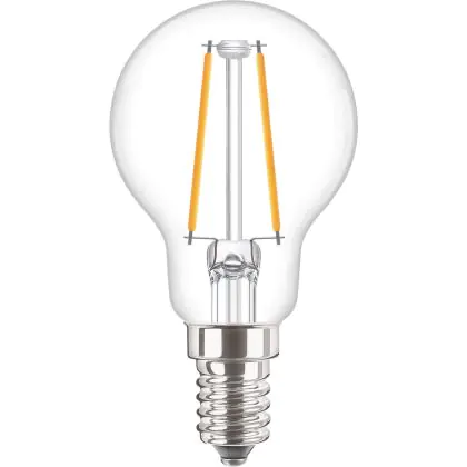 Die Philips Corepro LED Lustre E14 Kugel Fadenlampe Klar 2W 250lm - 827 Extra Warmweiß | Ersatz für 25W ist eine effiziente E14 LED-Lampe mit Retrodesign und der perfekte Ersatz für Ihre konventionellen 25W Lampen mit E14. Zudem strahlt sie Licht in der Farbtemperatur 2700K - Extra Warmweiß aus und punktet durch eine lange Lebensdauer.